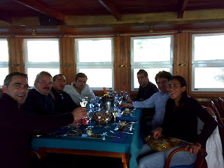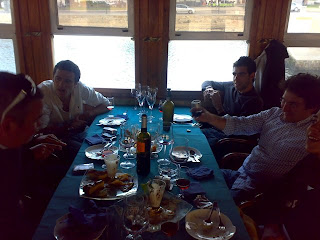 Acabamos por ser 6 a viajar até ao Seixal e depois até Lisboa,para visitar o certame "Encontro com os Vinhos e Sabores...Chegamos pelas 13.30h e começou o "desfile" de coisas boas para satisfazer o nosso apetite, que já era bastante..tudo muito bem regado (ver menu)...o almoço acabou só por volta das 17.30h...o que nos retirou algum tempo para visitar e provar os vinhos,mas sem duvida estávamos satisfeitos,com o que nos foi porprocionado pela Chefe Dina.